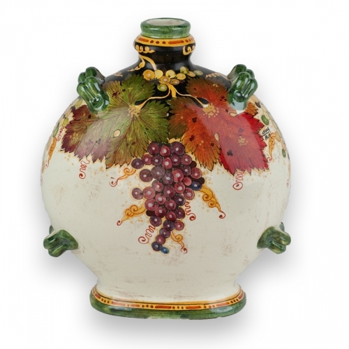 The unique shape and multiple handles on this handmade ceramic bottle, which features grapes and leaves on a black and cream background, truly make this a spectacular one-of-a-kind piece that will impress. Hand painted in Tuscany.