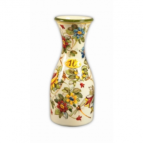 This gorgeous hand-crafted Italian pottery wine carafe is an excellent way to serve your favorite bottle of wine. It also makes a great gift! This is handmade and hand painted ceramic serveware from Tuscany and features a design of delicate dragonflies and detailed flowers.