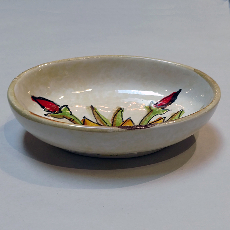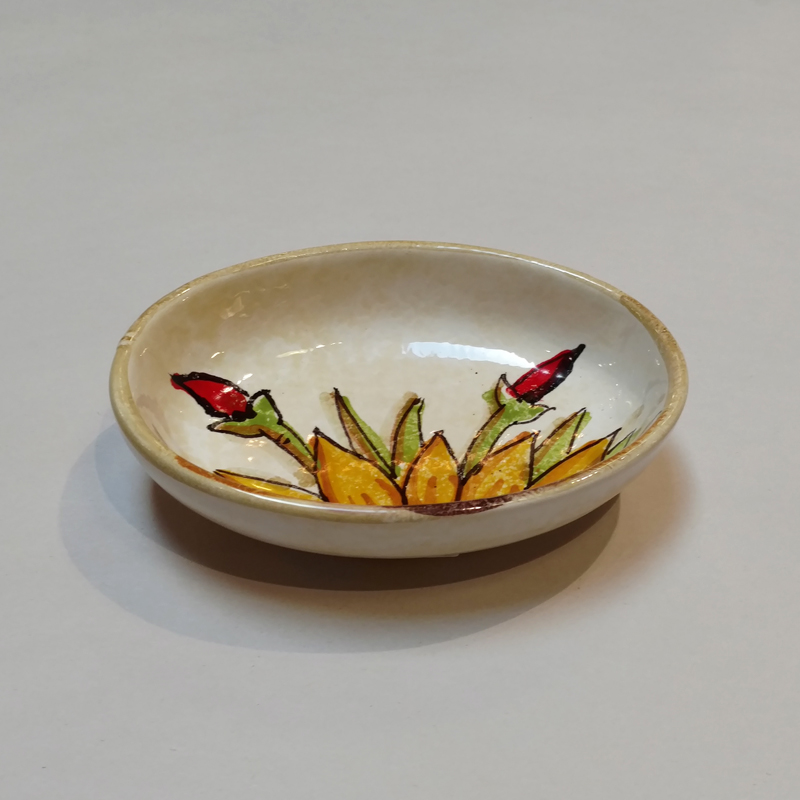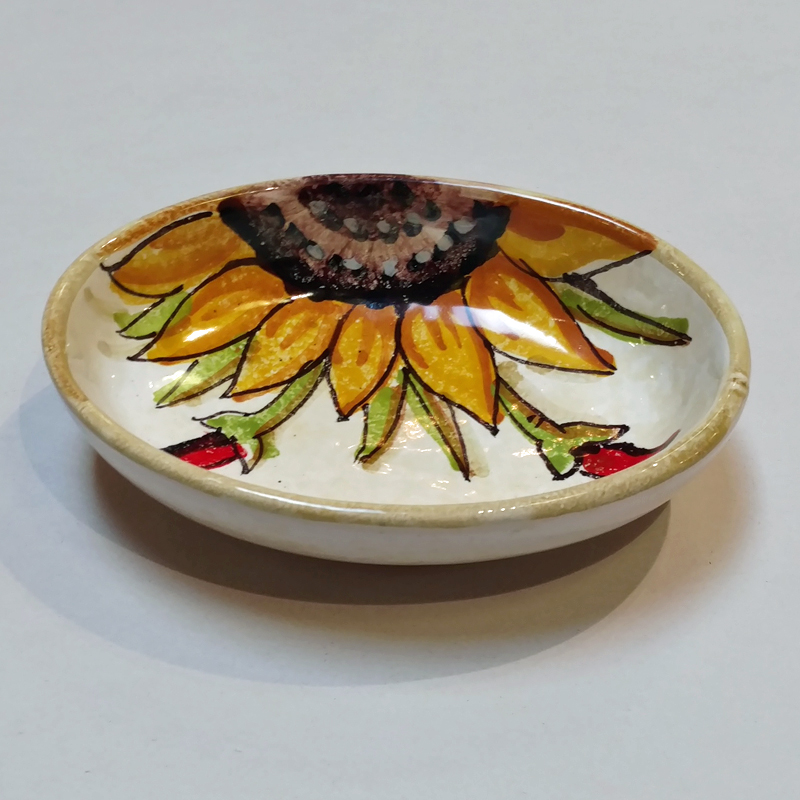 Audrey, our newest rustic sunflower and poppy design on a creamy background is as elegant as it is understated. This oval dish is a perfect soap dish, but also makes an adorable jewelry tray to corral your rings and things on your counter or bedside table. The walls are also deep enough to use this oval dish for sauces, or for oil and vinegar in which to dip a nice crusty bread. The lively sunflowers, poppies and leaves are striking against the soft, off-white background.