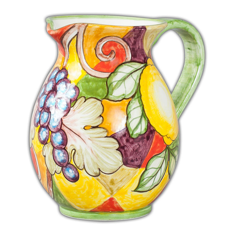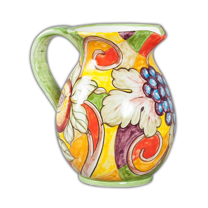 This collection from Tuscany mirrors Italy’s favorite silly acrobat with its friendly amalgamation of colors and flexible, fluid pathwork design. This beautiful handmade and hand painted Italian pottery pitcher is sure to brighten and cheer any kitchen or tabletop and bring an air of Florence to your home, a reminder of the rural countryside patches that form the quilt of the Tuscan landscape.