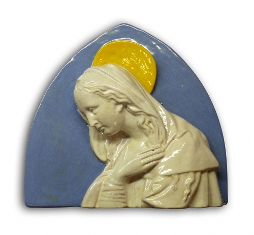 A dazzling, yet simply elegant Madonna in high relief framed by triangular background. In the distinctive white and blue Della Robbia style.