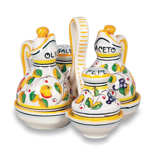 This lovely hand-painted ceramic salt, pepper, oil, and vinegar tray is a great way to bring an Italian feel to any meal.