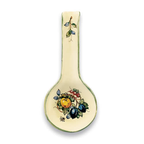 Decorate your kitchen while keeping your stove top clean. This beautiful Italian pottery spoonrest is the perfect touch of color for your kitchen. Handmade and hand painted, this ceramic kitchenware from Tuscany features bees and fruits–lemons, grapes and pomegranates.